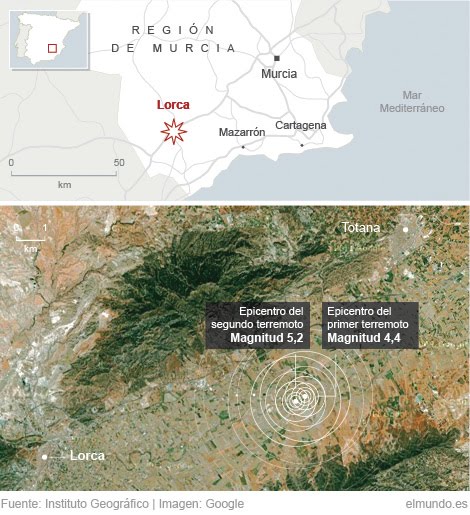 El epicentro de los dos terremotos que habían asolado la ciudad murciana de Lorca, a la que me siento vinculada y unida, dejando tras de sí 9 víctimas, muchas personas atendidas por los servicios de emergencia, casas destruidas y personas sin hogar que tendrían que pasar la noche a la intemperie ante la imposibilidad de volver a sus casas.